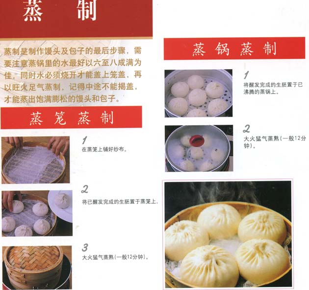 ---- 蒸馒头应以冷水(或温水)上笼,用中等火力。关火后不要马上开盖,放五分钟定形后再出锅。如果蒸火太急,馒头中心来不及受热膨胀,外皮面筋已过热凝缩,容易产生馒头揭锅回缩现象。