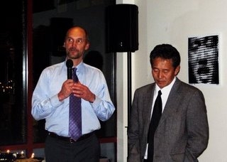 2、画展《Signs from Tibet》于11日在华盛顿展出。开幕式上,非政府组织ICT(国际支援西藏运动)主席John Ackerly(左)在讲话。右边是艺术家Losang Gyatso。