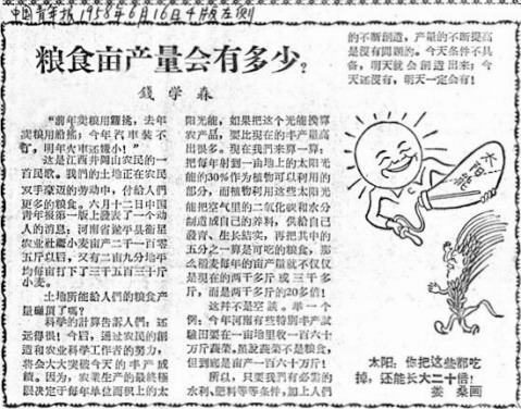 一年后,钱学森的计算又使亩产潜力精确为5.85万斤(钱学森:农业中的力学问题),从而为“大跃进”和粮食产量“放卫星”作了科学上的背书。