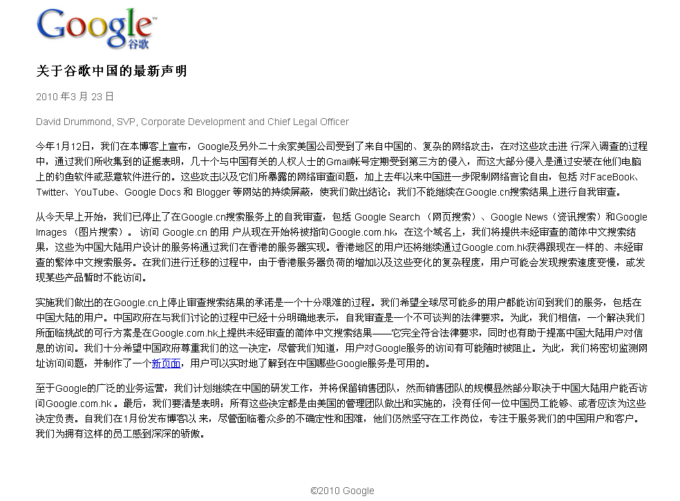 两个月前,Google以其网路遭骇以及中国异议人士的Gmail帐户遭监视的理由,表示重新考虑对中国的立场。布林接受纽时访问时说,这些事让他们「深感困扰」,他只差没说中国政府是幕后黑手。