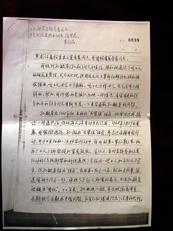 我收到孙毓星(孙耘)同志的来信,得知他通过了哈工大的研究生考试,总分为415.75。但因在文化大革命初期所犯的打砸抢错误,哈工大决定不予录取。哈工大这样决定,是完全可以理解的。然而,我仍想向党组织反映一些情况,希望有关的领导机关和领导同志重新考虑一下是否录取孙毓星的问题。