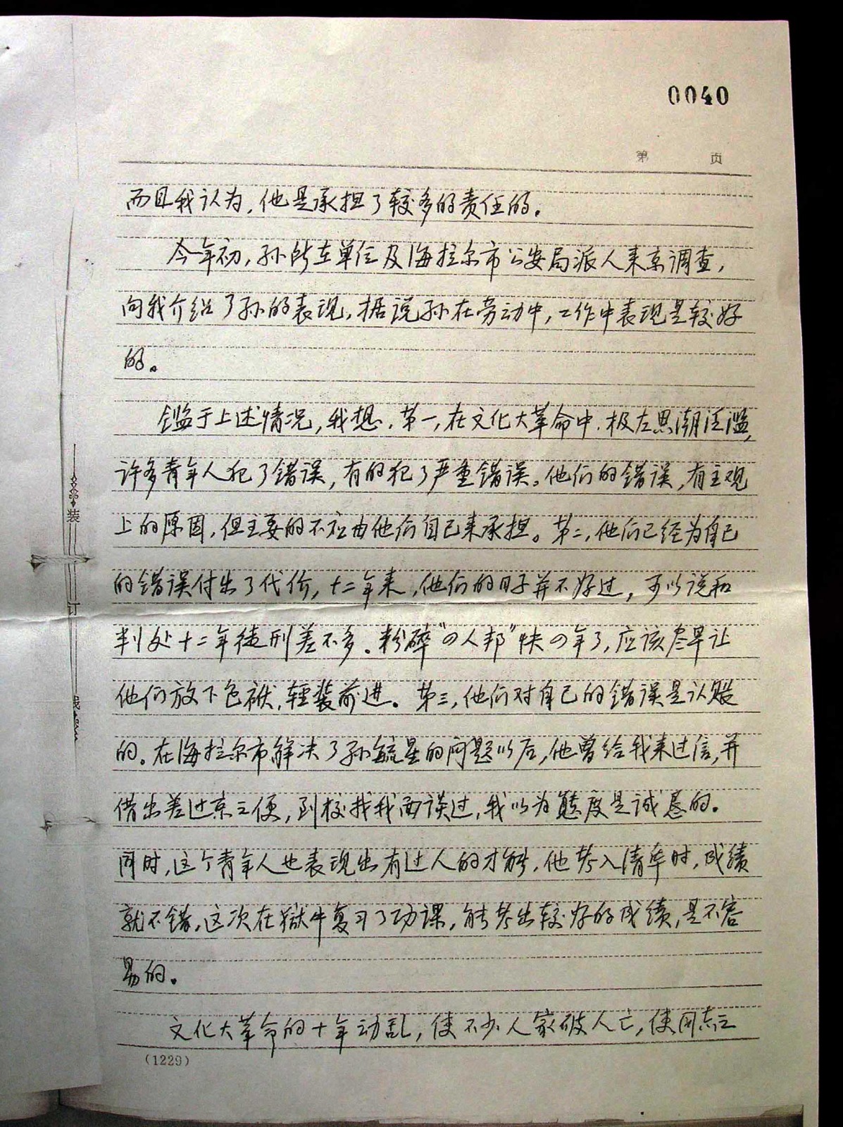 鉴于上述情况,我想,第一,在文化大革命中,极左思潮泛滥,许多青年人犯了错误,有的犯了严重错误。他们的错误,有主观上的原因,但主要的不应由他们自己来承担。第二,他们已经为自己的错误付出了代价。十二年来,他们的日子并不好过,可以说和判处十二年徒刑差不多。粉碎“四人帮”快四年了,应该尽早让他们放下包袱,轻装前进。第三,他们对自己的错误是认账的。在海拉尔市解决了孙毓星的问题以后,他曾给我来过信,并借出差来京之便,到学校找我面谈过,我以为态度是诚恳的。同时,这个青年人也表现出过人的才能,他考入清华时,成绩就不错,这次在狱中复习了功课,能考出较好成绩,是不容易的。