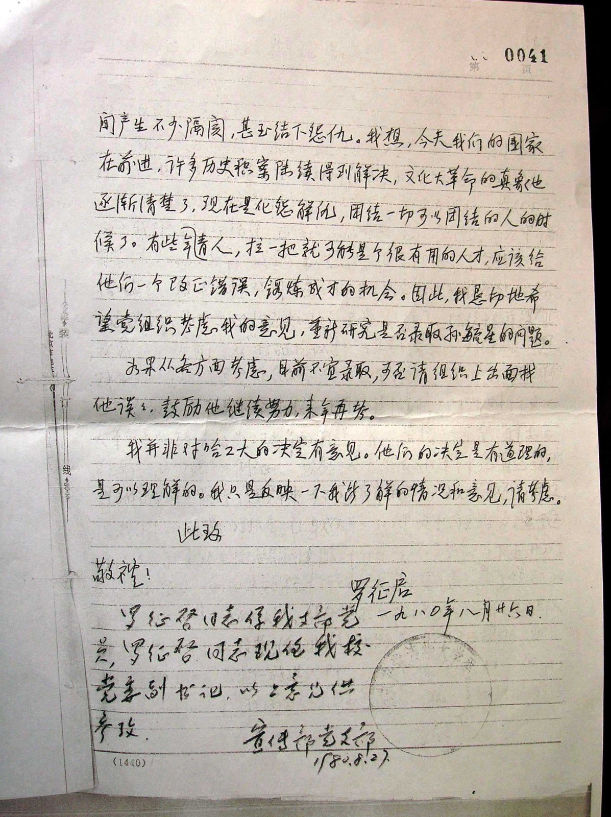 2008年我到哈工大查阅档案,居然找到当年罗老师的一封亲笔信。信中言辞恳切,对我不乏隐恶扬善的溢美之词,今日读来仍感动不已。