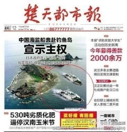 @文氏代言人:在十三亿炎黄子孙怀揣一颗滚烫的爱国心关注中方海监船去向何处的若干小时候后,我们终于可以在《楚天都市报》上见到两搜中国派出的海监船,