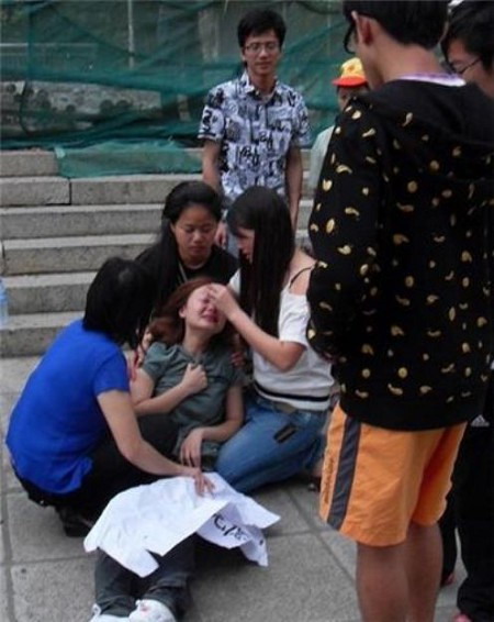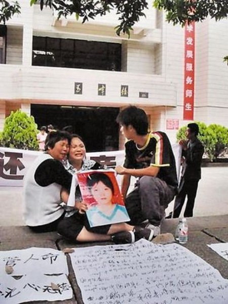 2009年5月4日,也就是案发第5天,郑晓燕家人聚集在该校医院门口,举着“还我亲人”“