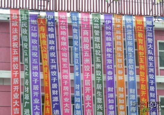 黑龙江省嫩江县一个饺子馆开业,外面的十多条横幅,就这样挂着。都是开祝福的!看看有哪些个单位:县政法委、县民政局、邮政局、人寿保险、地方铁路公司、县粮食局、县工商局、公路管理局、伊拉哈粮库、技术监督局、铁西派出所、嫩江教育局、嫩江巡警大队等等。