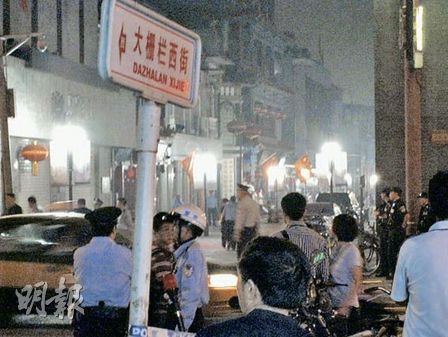 【蘋果日报讯】中共十七届四中全会举行期间丶中共建政 60周年庆典临近之际,距离天安门广场不到一公里的着名商业街大栅栏,昨晚发生严重的持刀伤人血案。凶徒沿路挥刀乱斩途人,最少造成两人死亡丶十二人受伤;事件惊动中南海。逾千武警丶公安在事後抵达现场,并封锁附近多个主要街道,截至今日凌晨仍未解封。