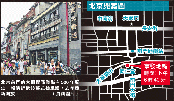 昨日傍晚 6时 40分,北京前门大栅栏发生严重伤人案,凶徒手持 10多厘米长的生果刀,在同仁堂药店附近杀出,见人即乱斩,街上民众和游客见状慌忙走避。官方新华社指,行凶者只有一人并已被捕。凶徒为 46岁吉林男子张健飞,未有透露行凶动机;而多名伤者则被送往附近的北京友谊医院丶宣武医院丶天坛医院和北京医院抢救,其中两人经抢救後不治,他们均为保安员。