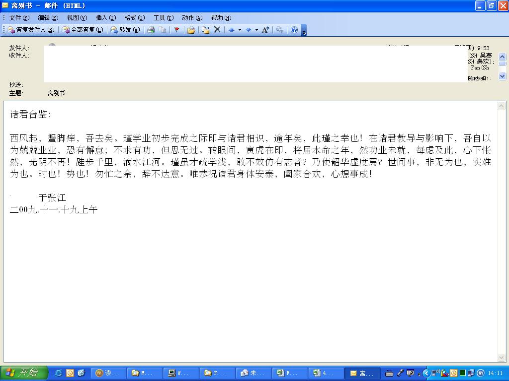 西风起,蟹脚痒,吾去矣。瑾学业初步完成之际即与ersonName w:st="on" ProductID="诸">诸君相识,逾年矣,此瑾之幸也!在君教导与影响下,吾自以为兢兢业业,恐有懈怠;不求有功,但思无过。转眼间,寅虎在即,将届本命之年,然功业未就,每虑及此,心下怅然,光阴不再!跬步千里,滴水江河。瑾虽才疏学浅,敢不效仿有志者?乃使韶华虚度焉?世间事,非无为也,实难为也。时也!势也!匆忙之余,辞不达意。唯恭祝诸君身体安泰,阖家合欢,心想事成!