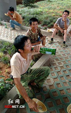 星岛环球网消息:7月7日正午12点,从怀化沅陵县凉水井镇渭溪乡的“朱氏集团”聚在一座高架桥底的荫凉处吃午饭。这群都姓朱的民工都在长沙的建筑工地上讨生活,天气炎热,伴随他们午餐的的是“冒烟”的水泥板和冰镇啤酒。
