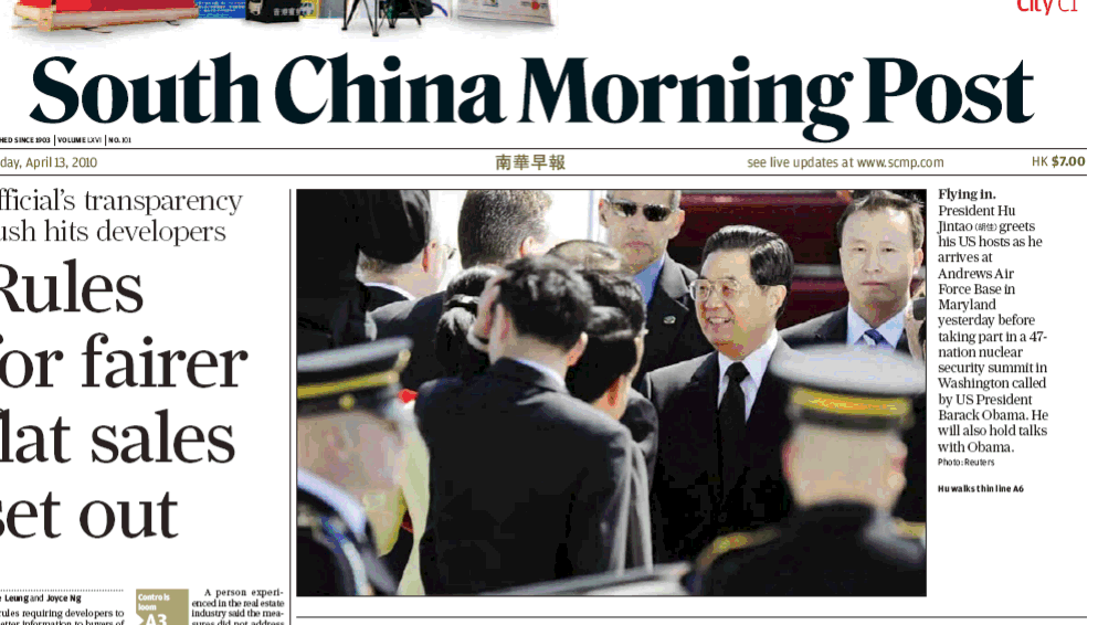 在《南華早報》的頭版報道中,刊登了胡錦濤抵達美國馬里蘭州安德魯空軍基地的照片,在相片的右側寫了相片說明「Hu Jintao(胡佳)」,錯譯了胡錦濤的名字,變成了中國維權人士胡佳。