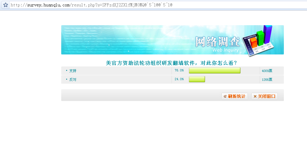 环球网发起投票“美官方资助法轮功组织研发翻墙软件,对此你怎么看?”
