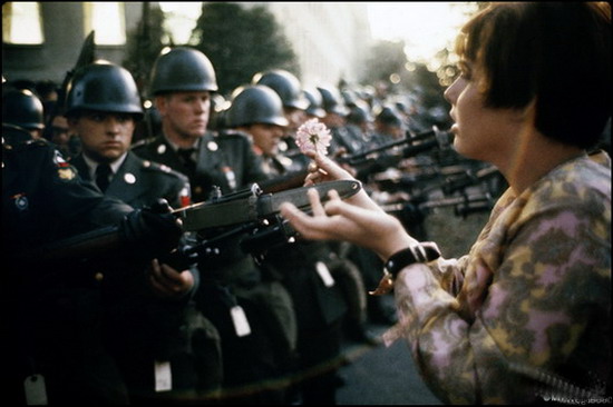 这幅照片是馬克·吕布最经典的作品,记录了华盛顿反战大游行中,17岁女孩简·罗斯用鲜花对抗枪炮的历史性