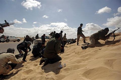 利比亚反对派力量在同政府军交火时隐蔽
