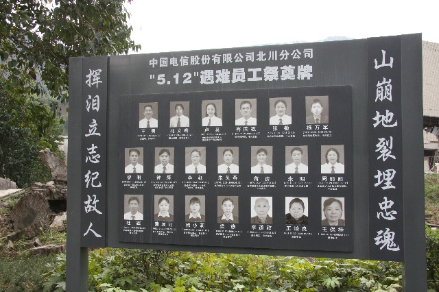 上图的上部是新北川中学初中部的遗址,5·12这天,学校整体全部被山崩的巨石覆盖,只有一个在操场上体育课班级的同学幸免。遇难者的遗体至今仍被巨量的山崩掩埋。在学校下方的那块草坪底下,集中掩埋了北川各处废墟中挖掘出来的遇难者遗体——故有“万人坑”一说,但据说真实数量是几千具。由于这里集中掩埋遇难者遗体,因此现在也是北川祭典遇难者的主要场所——现在定名为北川“遇难者公墓”。