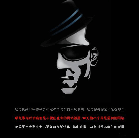 黑客在网站首页留言:“尼玛耗资30w你就弄出这么个鸟东西来坑爹啊...尼玛你说你是不是在炒作。唱红歌可以治病但是不能防止你的网站被黑,30万做出个满是漏洞的网站.。尼玛堂堂大学生你不学好啊你学炒作...你们就是一帮新时代不争气的饭桶!!