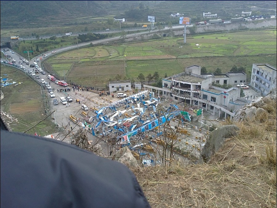 11月1日11点30分左右,某公司从湖南运送两车炸药到贵阳,途径福泉市境内的兰海高速马场坪匝道口修理厂时发生爆炸。目前,已造成4人死亡,200多人送医院检查,其中30人不同程度受伤。图为收费站遭到损毁