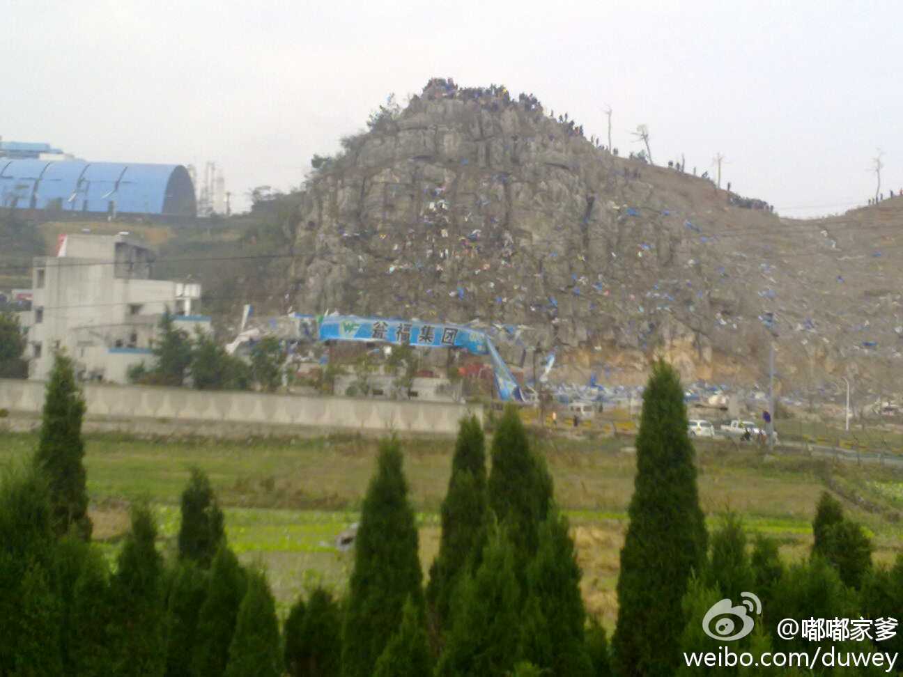 看见山上蓝色的碎片没,那就是车。