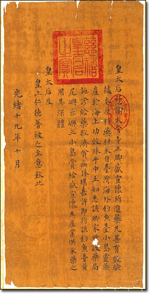 皇太后慈谕:太常寺正卿盛宣怀所进药丸,甚有效验,据奏原料药材,来自台湾海外钓鱼台小岛,灵药产于海上,功效殊乎中土,知悉该卿家世设药局,施诊给药,救济贫病,殊甚嘉许,即将该钓鱼台、黄尾屿、赤屿三小岛赏给盛宣怀为产业,供采药之用,其深体皇太后及皇上仁德普被之至意。钦此。光绪十九年十月。