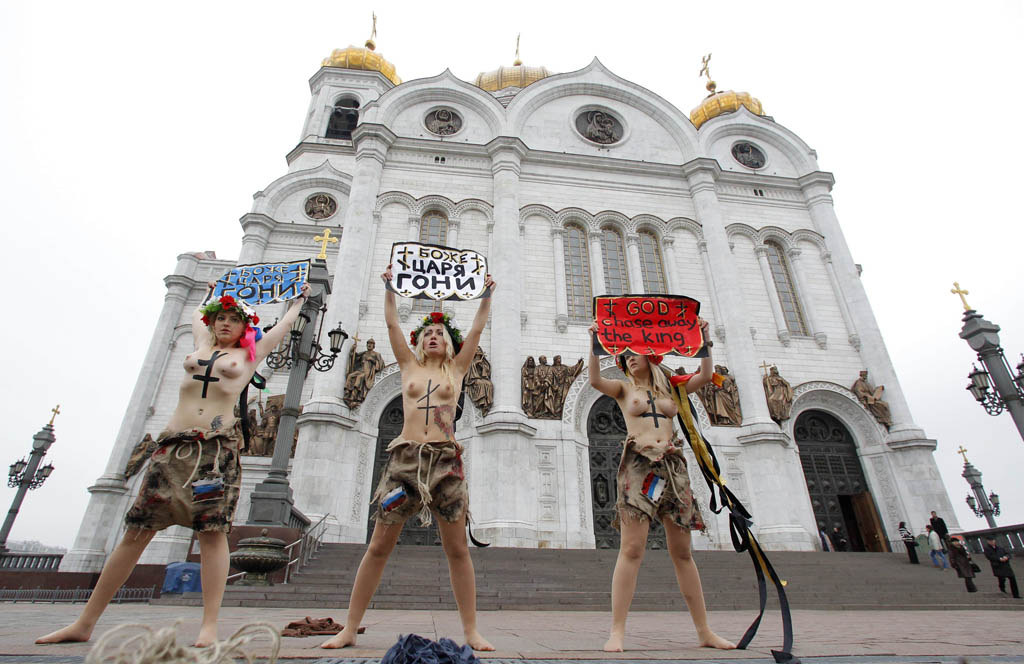 道译_see99:乌克兰女权组织发起运动支持俄罗斯民众的“为了真实的选举”的抗议活动,其中三位积极的姑娘来到莫斯科,在一座著名的教堂前,不过猎猎寒风,赤裸上身,响应俄罗斯民众的示威抗议。