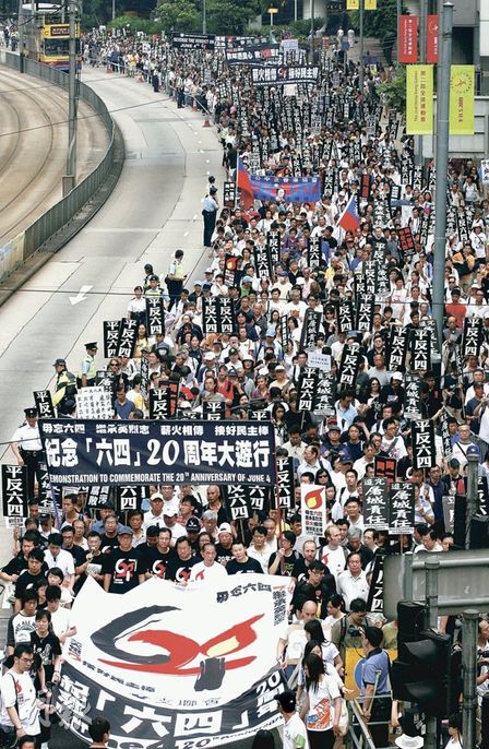 20年不想回忆的路, 8,000颗未能忘记的心;六四 20周年大游行,有 8,000人响应,创下 1992年以来六四游行人数新高。还有一项纪录,流亡海外的八九学运领袖熊焱今年加入带领游行,是香港首次有学运领袖参与的六四大游行。