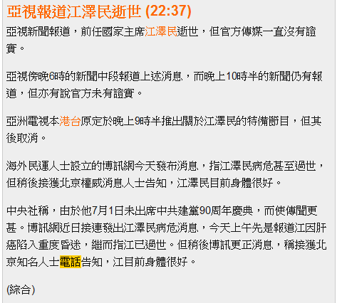 亚视本港台本来说9:30~10:30播出江泽民的特别节目的,结果没有了。