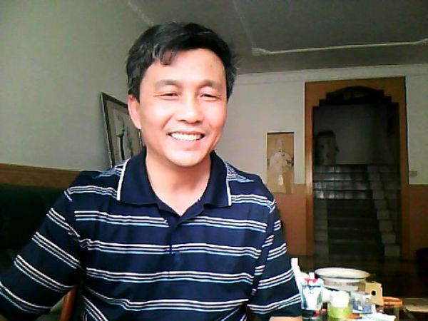 拍摄于2011年7月16日。是新唐人电视记者采访我后,说我原来的照片太严肃了,像个老夫子,要我弄张带笑的照片给她,做电视背景画面。借着与她玩笑逗趣的劲儿,我就用本本摄像头拍了一张带笑的给她,她说这张很好。
