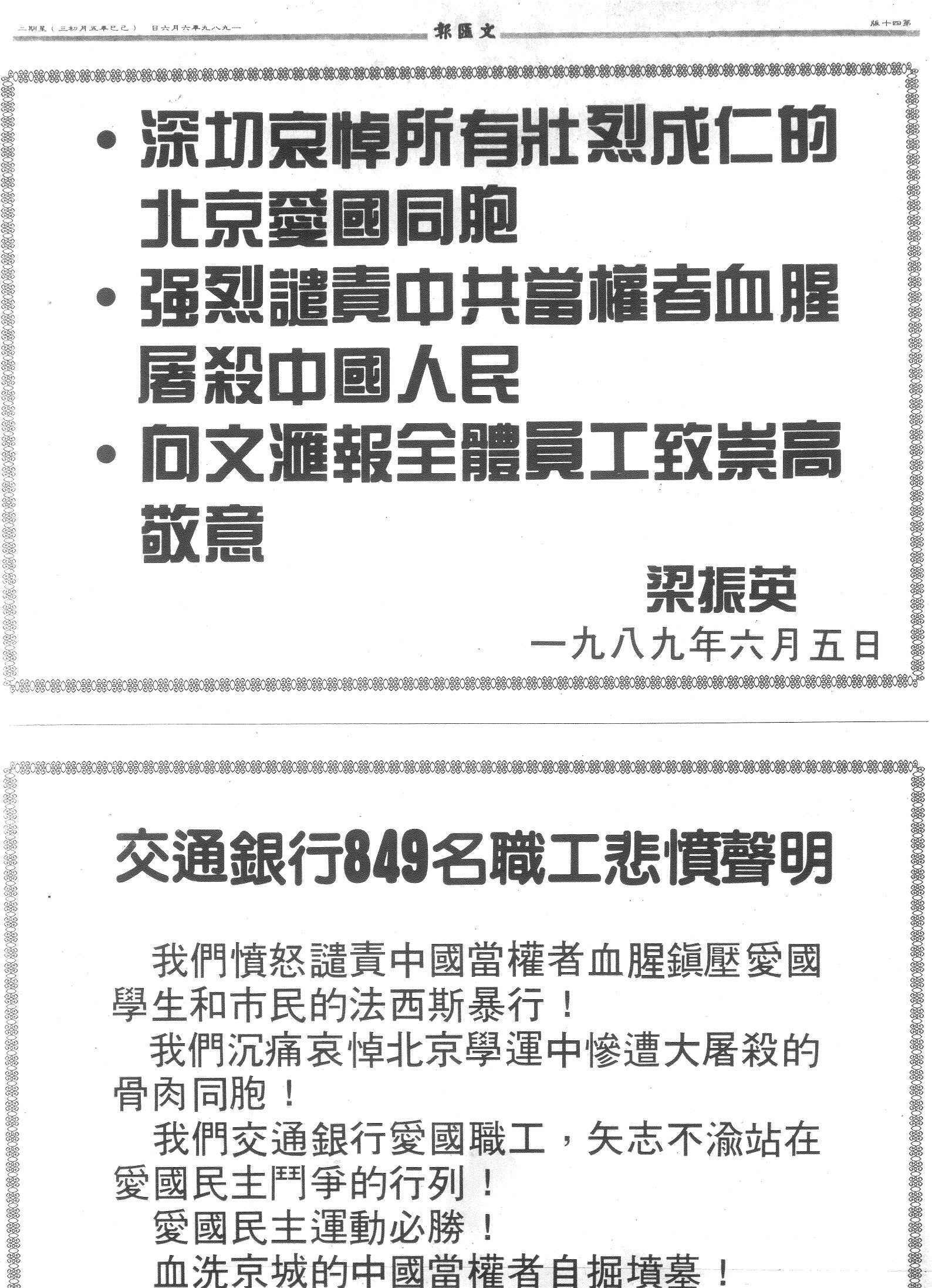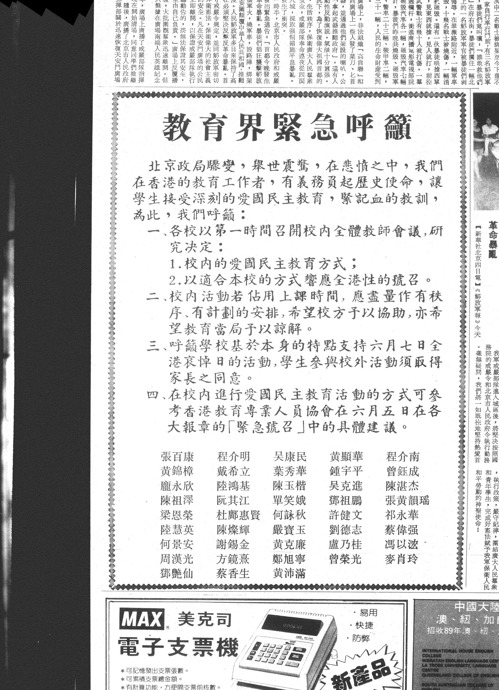 陳 雲 飛 因 兩 年 前 刊 登 了 一 則 小 廣 告 ( 紅 框 內 ) , 昨 日 再 被 拘 押 。