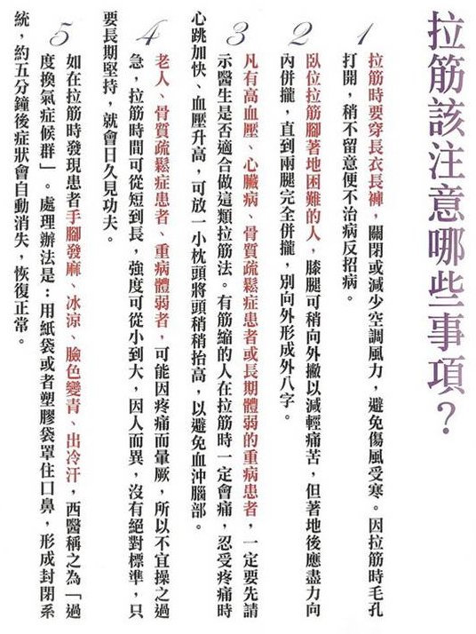 • 開始拉筋時,腳一擱上去,可以緊,可以酸,但就是不能痛!因為這時候的痛是身體的一種警告,代表筋已經達到安全極限了,不能再逾越了!如果不予理會而逾越了這個極限,就會造成筋的撕裂傷(微血管也會破裂)。筋一旦撕裂了,至少要三個月才能復原,而且復原後的筋會更短更硬,更不容易拉長。