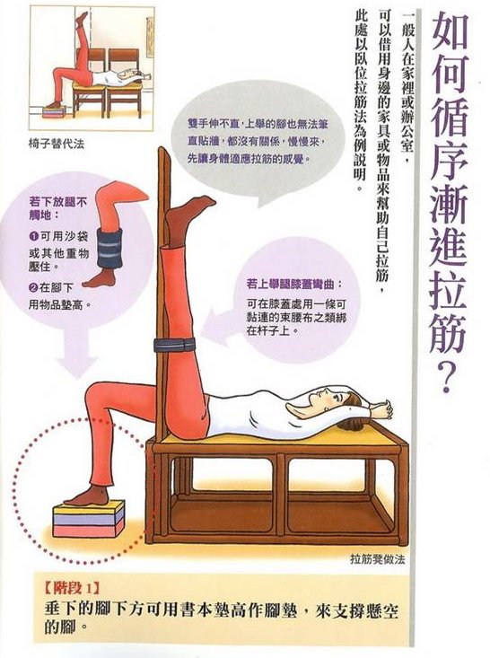 • 筋初步拉緊之後,要靜止不動,靜靜等候筋鬆軟的信號,通常1~2分鐘後,就能感受到筋已經鬆軟了,這時候才可以進一步拉緊(屁股往立板再貼近一些)。請注意!在未收到筋鬆軟的信號前,嚴禁進一步拉緊!