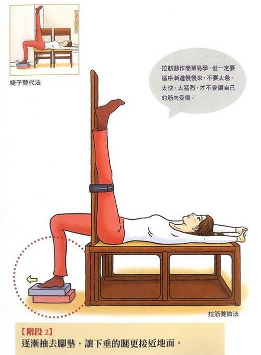 • 剛做完臥式拉筋,走路要小心滑倒,因為腳的知覺尚未完全恢復!最好先躺著活動腳踝、腿部,確定一切恢復正常後再起身走路。