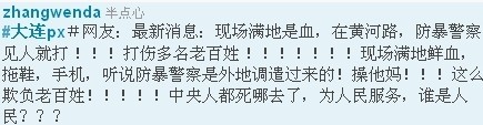 我是大连的,我不是五毛,今天的游行很和谐,没有暴力事件发生,我晚10点左右驾车经过黄河路和人民广场,依然有很多人,武警对列保持的还很好,人们也都静静的谈论着,没有楼主说的那些事情…… 要理智不要谣言!微博上面也是谣言满天飞,白天的时候活跃在微博上的他们在现场,提供了图片和文字,一切都很和谐。我相信他们发的。晚上,由于大连这边的微博封锁,那些活跃的大连网友没法上网了,一些不认识的所谓“大连的博友”就开始说什么打人了,催泪弹了,各位……这个没有啊!!