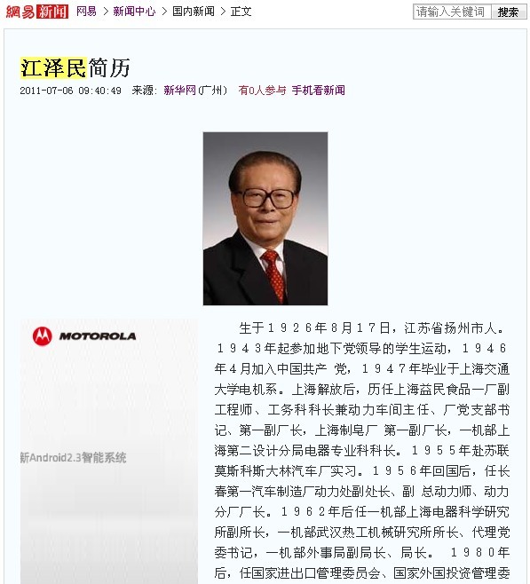 Rumours of DeathOn 6 July 2011, a few days after he was conspicuously absent from a CCP birthday gala[14] it was rumoured on various websites that he had passed away - to such an extent that Chinese internet censors are reported to have had to step in[15]. [16]