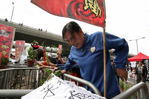 几十名民主活动人士星期天早早来到北京中央政府驻香港联络办公室附近扎棚。他们带着支持中国茉莉花革命的标语牌,和一盆一盆的茉莉花,准备将茉莉花种在中联办大楼前的花园内。与此同时,人数超过抗议者几倍的香港警察用铁栅栏阻挡示威者,不让他们接近中联办大楼。