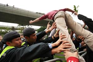 示威人士踏上铁栅栏, 试图冲破警方封锁被强力阻拦