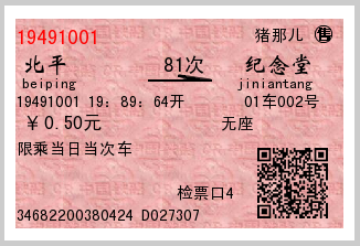 原帖由 馬六甲 于 2010-10-22 23:52 发表 1.票号:19491001 2.售票点:豬哪兒 3.乘车站:北平 4.到站:紀念堂 5.车次:81 6.票价:5毛 7.乘车日期及开车时间:19491001 19:89:64 8.座位号:1/2 9.席别:( H ) A.硬座 B:软座 C:硬卧 ...
