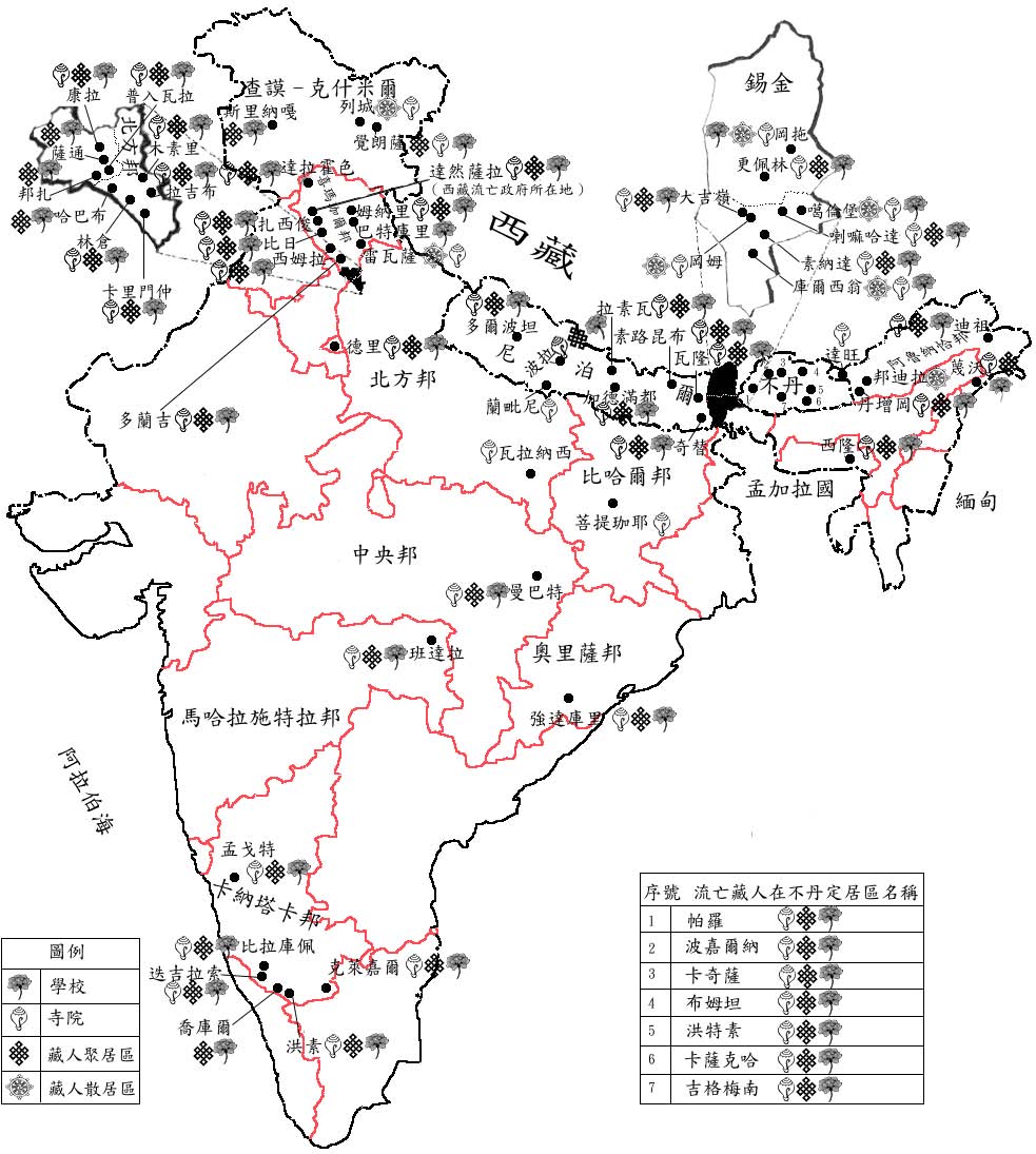 其中第五和六類的定居屬於在安置期間流亡藏人自行聚居目的而形成的定居點,其他則包括歐美在內的在世界各地之流亡藏人。