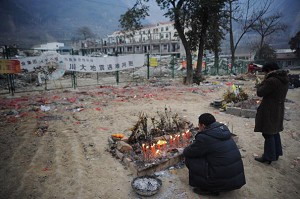 北川,今年农历新年前夕,亲人烧纸钱纪念四川地震死于校舍倒塌的孩子。(China