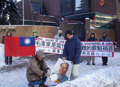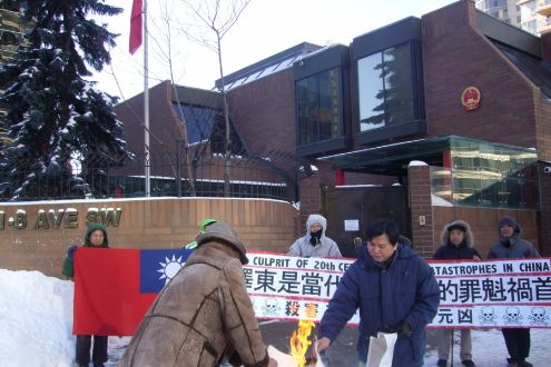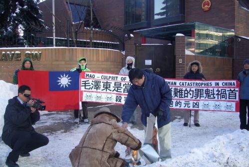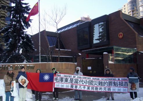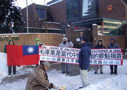 冒著零下十多度的刺骨严寒,鲁德成和支持中国民主的朋支在加拿大卡加里中国总领事馆门外举行示威,配合美国洛杉矶的民运朋友同日举行声讨毛泽东滔天罪行的抗议活动。示威者手持“毛泽东是当代中国灾难的罪魁祸首”、“杀害八千万同胞的元凶”和“MAO ━ CULPRIT OF 20th CENTURY HUMAN CATASTROPHES IN CHINA”的巨型横幅、两张涂污的毛象和一面中华民国国旗,并敲打大鼓助威。