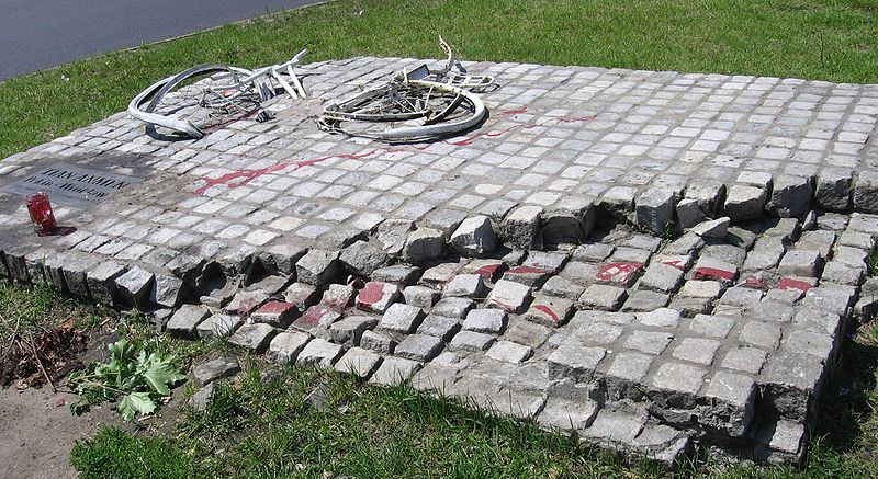 The version in the photograph was erected ten years later, in 1999, and the symbolism is identical: bicycles against tanks...