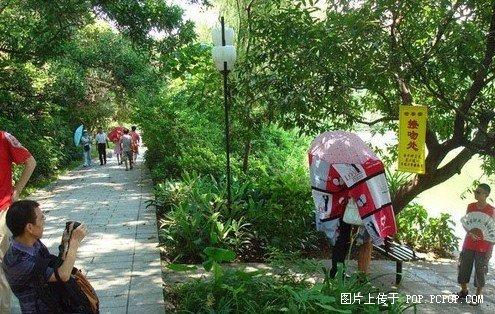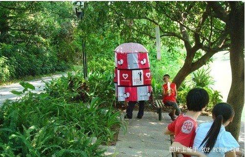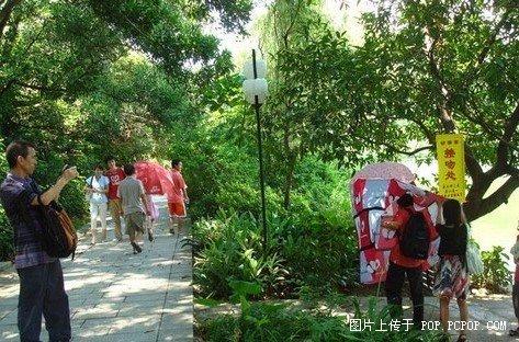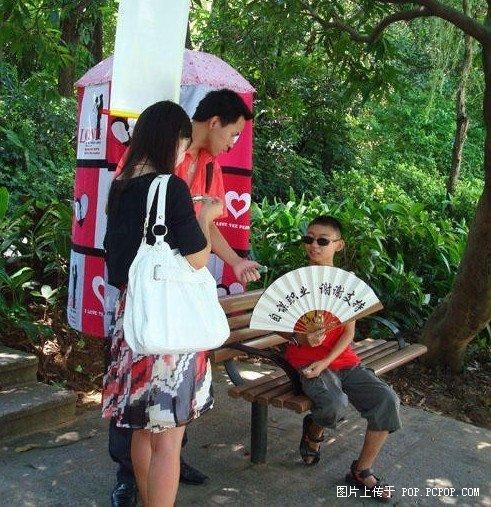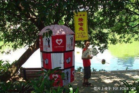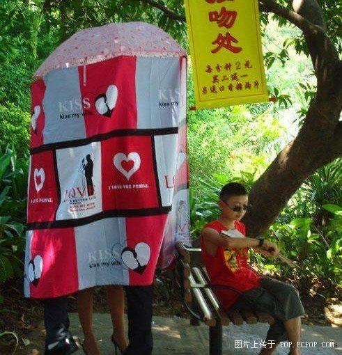 2009年7月8日13时许,深圳莲花山公园小湖的西岸边,惊现雷人一幕。曾在今年六一儿童节在深圳中山公园门口坐宝马“钓后妈”的13岁男童,又出雷人怪招。其用一把带有心型图案的粉红色雨伞和一个带有接吻图案的花床单,制作成一个花轿式“接吻处”,并悬挂在树枝上进行“经营”。接吻处上方还挂着一个很雷人的广告条幅,上面写着“甜蜜蜜接吻处,每分钟2元,买二送一,另送口香糖两片”。男童手里还轻摇着一把写着“自谋职业,谢谢支持”字样的折叠扇。其举止言谈,很象是一个生意老手。 男童的“独特经营”,不时吸引游人回头观望。不到半小时时间,便有两对情侣上前捧场。