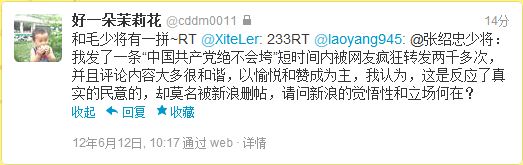 啊,刚刚明白过来,是张将军说共产党绝对不会垮台,怪不得网民欢呼雀跃,怪不得新浪急急忙忙删帖,太他妈的恐怖了!