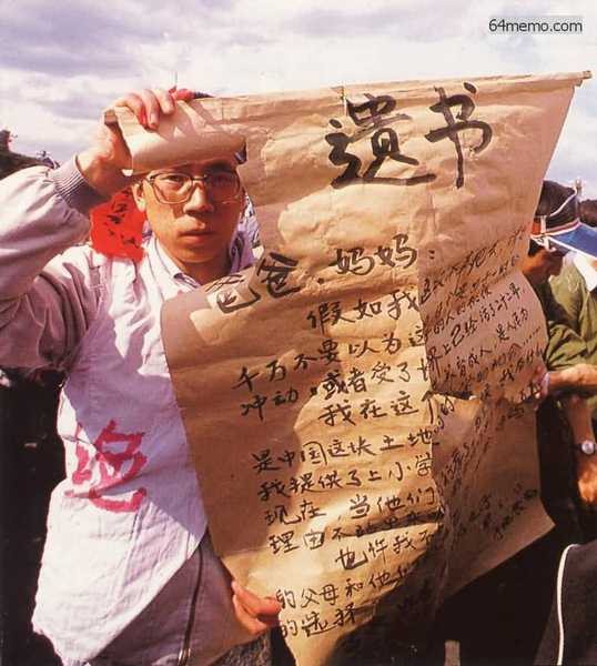 動,六四後被捕入獄。圖為他在廣場絕食,手持話筒指揮糾察隊,衣服上寫道「我們終將勝利」。.jpg