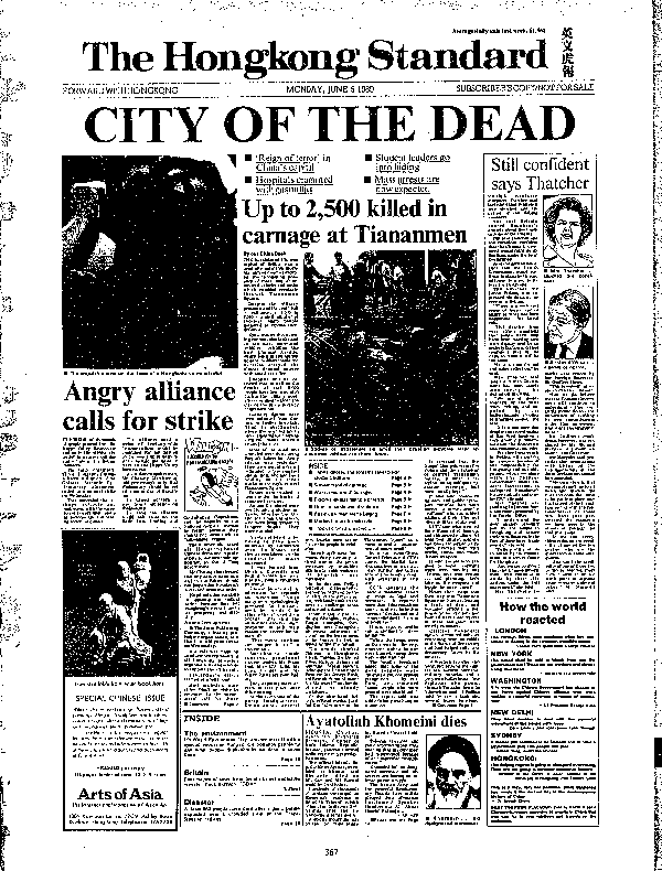 一九八九年六月四日下午六時報告:現場死亡及送抵醫院證實死亡人數,一百四十九人。