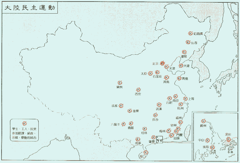 一九八九年四月、五月、六月初,全國有二十一個城市發生五千人以上規模的遊行示威、集會、請願活動,參加的共有三百七十二萬人次,其中有大專院校學生和教員、工人、農民、黨政機關幹部、知識分子、民主黨派工作人員、復員軍人、中小學學生和教員、退休職工等。