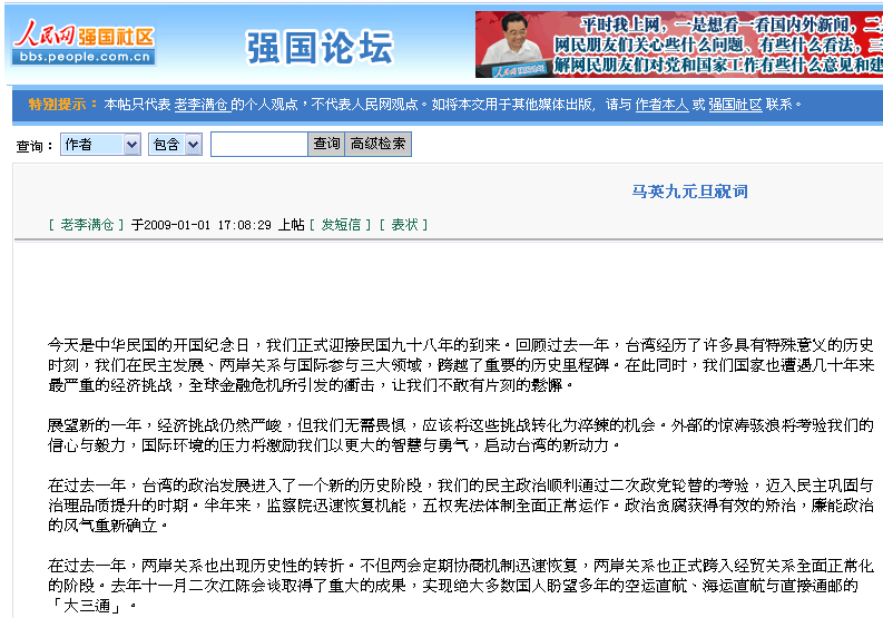 今天是中华民国的开国纪念日,我们正式迎接民国九十八年的到来。回顾过去一年,台湾经历了许多具有特殊意义的历史时刻,我们在民主发展、两岸关系与国际参与三大领域,跨越了重要的历史里程碑。在此同时,我们国家也遭遇几十年来最严重的经济挑战,全球金融危机所引发的冲击,让我们不敢有片刻的松懈。  展望新的一年,经济挑战仍然严峻,但我们无需畏惧,应该将这些挑战转化为淬炼的机会。外部的惊涛骇浪将考验我们的信心与毅力,国际环境的压力将激励我们以更大的智慧与勇气,启动台湾的新动力。  在过去一年,台湾的政治发展进入了一个新的历史阶段,我们的民主政治顺利通过二次政党轮替的考验,迈入民主巩固与治理质量提升的时期。半年来,监察院迅速恢复机能,五权宪法体制全面正常运作。政治贪腐获得有效的矫治,廉能政治的风气重新确立。  在过去一年,两岸关系也出现历史性的转折。不但两会定期协商机制迅速恢复,两岸关系也正式跨入经贸关系全面正常化的阶段。去年十一月二次江陈会谈取得了重大的成果,实现绝大多数国人盼望多年的空运直航、海运直航与直接通邮的「大三通」。  在过去一年,台湾的国际形象与国际地位也获得明显的改善。台湾海峡不再是东亚国家忧虑的冲突引爆点,在我们所有重要盟邦的心目中,台湾已经成功转型为东亚和平的缔造者。去年五二○就职前,副总统当选人萧万长先生出席大陆博鳌论坛,同年十一月,连战先生首度代表台湾出席亚太经济合作会议(APEC)经济领袖会议,皆让亚太国家刮目相看。  尽管有这些值得我们欣慰的重大突破,但执政团队却无欣喜之情,因为去年由美国次贷危机引发的金融海啸,席卷全球,其蔓延速度之快,冲击力道之大,波及层面之广,出乎所有人预料之外。为了强化银行抵御风险的能力,政府采取了果断的措施,除降息外,去年十月初就率亚洲各国之先,为所有国内银行的存款户提供全额保障,有效稳定国内的金融形势。为了防止景气急速下滑,政府也推出「因应景气振兴经济方案」,同步扩大公共投资、刺激消费与促进就业,并积极协助具国际竞争力的产业度过难关。  虽然如此,目前经济情势还是非常严峻,我们接到许多民众的陈情,担心失去工作。英九听到后,心里一样感到忧心与难过。我要在此向全国的企业主呼吁,员工是企业最大的资产,在可能的范围内,希望尽量不要裁员,与员工携手打拚,撑过经济不景气。  为阻挡失业率的攀升,除了现有12万人的就业计划之外,行政院刘院长在前天年终记者会表示,将推出劳工「充电加值」计划,可协助「无薪假」员工接受职业训练,每人1万元,为期半年,受惠人数达16万8千人。另外,「爱台十二建设」推动,可创造4年22万个就业机会。开拓新兴国家市场争取订单方面,推出「新郑和计划」,投入85亿元,可望得到5400亿元的外贸成绩,约可保住20万个以上就业人口的工作机会。  政府除了推出短期与中长期促进就业方案,以及协助企业取得融资外,也一定体会劳工的心情,积极地协助企业稳定就业,帮助失业的劳工得到适当的训练及再就业的机会。另外,相关部会尤其要注意失业所可能引发中低收入家庭的经济危机,及时给予急难救助,协助脱离困境。  各位乡亲父老,长期以来台湾经济高度倚赖对外贸易,因此很容易受到全球经济衰退的影响。不过,我们的体质健全,相较于其它亚洲国家,台湾的外汇存底厚,家庭与企业的负债低,企业的灵活应变能力高,银行的不良金融资产比例小,抵御外部风险的能力还是比较强。所以,英九相信,只要我们信心坚定,充分发挥台湾人勤奋、强韧与坚忍精神,政府与民间紧密合作,企业与劳工共体时艰,我们一定可以冲破经济的难关。  然而,安然度过这一波全球经济衰退,并非我们面临的最大挑战。我们须清楚认识到,经过这一波的金融海啸后,全球必然迈入经济版图快速重组的时期,国家竞争力的强弱也将出现明显的区分。有些国家将在新一轮的知识经济竞赛与绿色产业革命中脱颖而出,有些国家可能因为无法有效改造经济体质而陷入长期停滞。因此,我们所面临的最大挑战是:当全球经济扩张的动力重新启动时,台湾是否能在新一轮的国际竞争中赢在起跑点上?  越是处于惊涛骇浪之中,我们越要牢牢盯住远方的目标,越要稳稳的掌握国家方向的轮盘;越是在经济情势严峻之际,政府更要缜密规划公共资源的配置,以追求最有效改善经济体质的策略。因此,今年政府将陆续推出包括「爱台十二建设」在内的各项振兴经济方案,不仅仅是着眼于短期的救急效果,而是着眼于如何提振台湾新的国际竞争力,如何创造台湾经济的新核心价值。  未来,政府将全力迈向三大目标:打造台湾为全球创新中心、亚太经贸枢纽以及台商营运总部,这将是带动国家竞争力全面提升的三大主轴。而贯穿这三大主轴的核心战略就是人才的培育。台湾地狭人稠、天然资源有限,人力资源才是台湾最珍贵的资产,也是知识经济时代国家竞争力的根本。未来政府不但要在教育、科技与文化领域投入更多资源,积极培育本地人才,也要配合人口结构变化长期趋势,实时调整高等教育资源的配置,更要充分利用台湾社会自由、多元开放的特性,吸引全世界的人才落脚台湾。  在全球经济面临严重衰退之际,我们应将外部压力转换为大刀阔斧改革内部的动力。外部冲