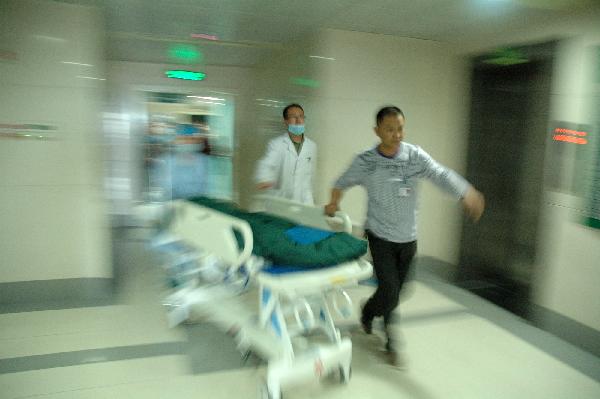 Medical workers take an injured child to ICU at 3201 Hospital in Hanzhong City, northwest China's Shaanxi Province, May 12, 2010. At least eight were hacked to death and 20 others injured in a violent attack at a kindergarten in Shaanxi Province at about 8 a.m. Wednesday morning. The murderer has killed himself and the injured have been rushed to hospital. (Xinhua/Wu Tianchang)