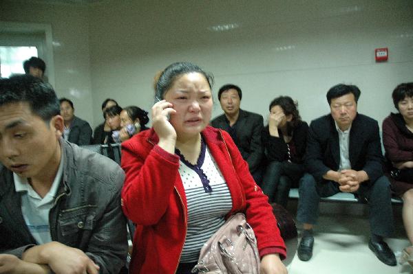 Anxious parents and relatives wait at 3201 Hospital in Hanzhong City, northwest China's Shaanxi Province, May 12, 2010. At least eight were hacked to death and 20 others injured in a violent attack at a kindergarten in Shaanxi Province at about 8 a.m. Wednesday morning. The murderer has killed himself and the injured have been rushed to hospital. (Xinhua/Wu Tianchang)