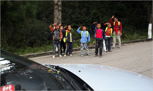 些孩子向过往的车辆敬礼,山路很窄很危险,孩子们都很小,敬礼敏捷而友好,对我而言这个样子并不习惯,但的确让交通变得安全,同车的中国人则觉得这样的行