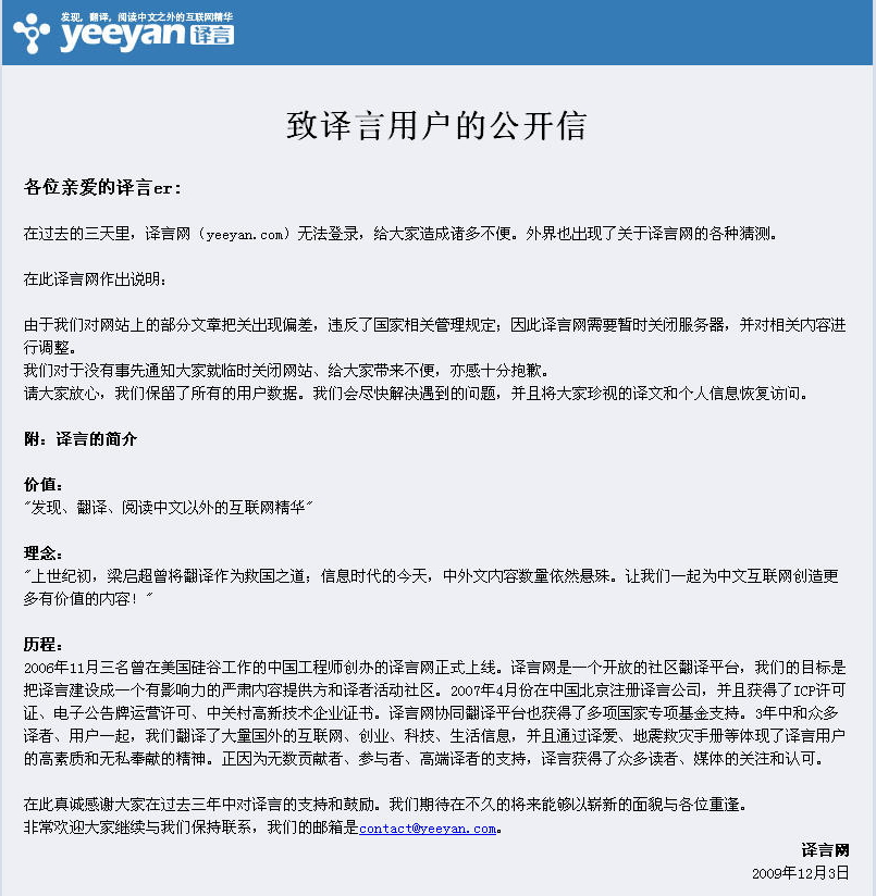 以下是译言给它的用户的公开信。